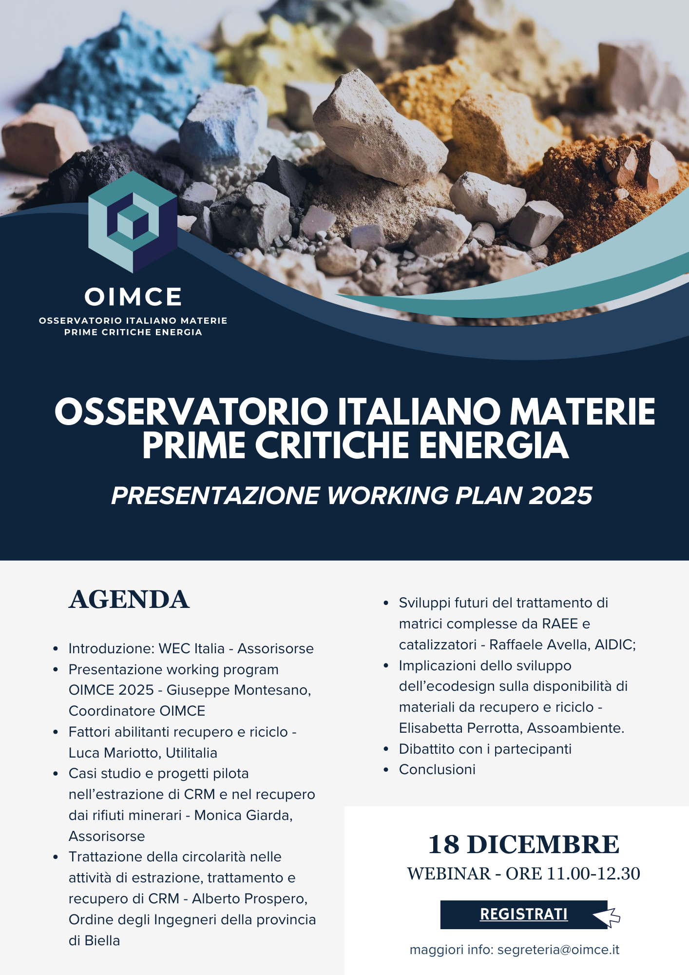Il 18 Dicembre 2024 il Segretariato dell'Osservatorio Italiano Materie Prime Critiche Energia - OIMCE, la piattaforma permanente di approfondimento e confronto sui CRM promossa da WEC Italia e Assorisorse, ha presentato i risultati del primo anno di lavoro e il working plan del network per il 2025.