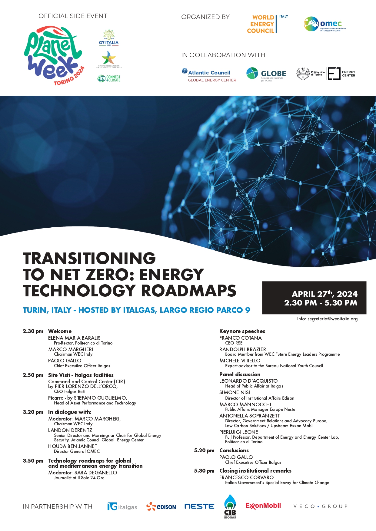 In the contest of the Planet Week of the Italian-lead G7 Environment, Climate and Energy, WEC Italy is glad to present the workshop "Transitioning to Net Zero: Energy technology roadmaps", organized in collaboration with OMEC, Atlantic Council, Globe Italy and Politecnico di Torino, that will be held the next 27 of April from 2.30 pm to 5.30 pm (CET time) at Italgas headquarters (Turin, Regio Parco 9).